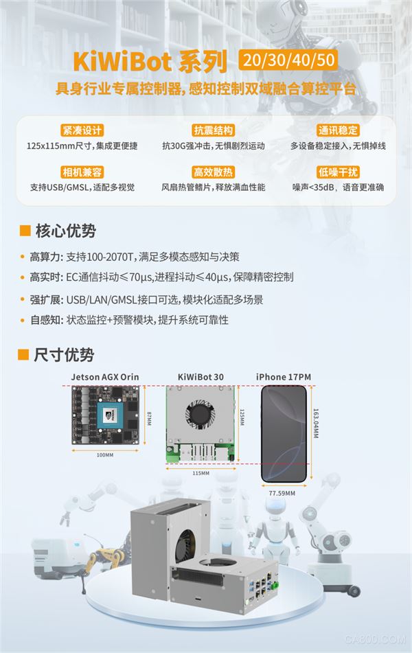 一、三代精进:体积与性能的协同进化面对具身机器人对控制器小体积、高性能、高稳定性的严苛需求,阿普奇KiWiBot控制器历经三代演进,实现关键突破: