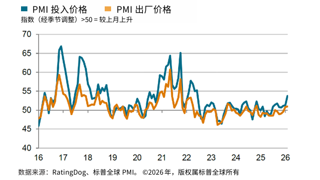- 原料需求增加,投入价格涨速升至 44 个月高点
