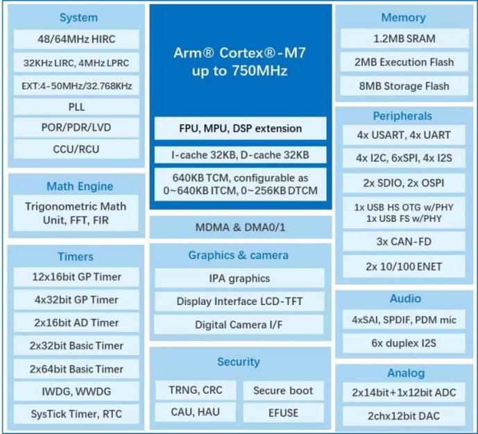 兆易创新正在重新定义这种边缘控制的基准。在复杂的机器人关节模组中,MCU不仅要负责电机的高频换相,还要实时处理编码器位置、扭矩反馈甚至温度保护。兆易创新的GD32H7系列微控制器,正是为此类高负载场景而生。该系列产品基于Arm Cortex-M7内核,主频高达750MHz,配备高速大容量内存架构及640KB可与CPU同频运行紧耦合内存(TCM),实现了高性能、低动态功耗与高速通信的有机统一。该系列MCU在外部存储与扩展连接方面展现出高度灵活性,配备2个OSPI接口支持高达200MHz时钟频率与双倍数据速率(DTR)模式,可高效直连PSRAM、HyperRAM、NAND Flash及NOR Flash等多种外部存储器,实现高速数据交换。